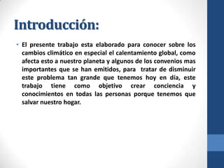 Este documento resume varios tratados y convenciones importantes sobre cambio climático, como la Convención de Estocolmo sobre contaminantes orgánicos persistentes de 2001, la Cumbre de la Tierra de Río de 1992, la Cumbre de Johannesburgo de 2002 y la XVI Conferencia sobre Cambio Climático de Cancún de 2010. Explica que estos acuerdos buscaron reducir los gases de efecto invernadero y abordar problemas como la deforestación y la pobreza.