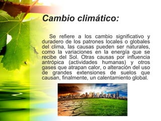 Este documento trata sobre el cambio climático. Define el cambio climático como cambios significativos y duraderos en los patrones climáticos locales o globales, causados por factores naturales como variaciones en la energía solar o factores humanos como emisiones de gases de efecto invernadero. Explica que dos de los principales efectos del cambio climático son el calentamiento global, un aumento de la temperatura atmosférica desde finales del siglo XIX, y el efecto invernadero, donde los gases atmosféricos atrapan el