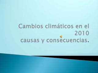 Las causas principales de los cambios climáticos son la quema de combustibles fósiles y la deforestación, lo que aumenta los gases de efecto invernadero y el calentamiento global. Esto provocará consecuencias como el aumento de las áreas desérticas, la fusión de los glaciares y el aumento del nivel del mar, así como mayores precipitaciones e inundaciones. Para abordar este problema, debemos reducir las emisiones de gases de efecto invernadero a través de energías renovables, y aumentar las áreas forestales para absor