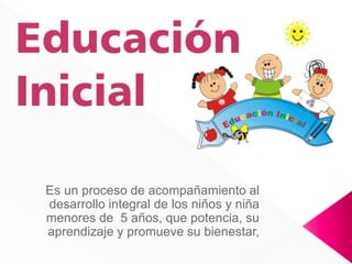 El documento describe los cambios en el currículo de educación inicial en Ecuador. Se ha reformado el currículo en 1996 y 2008, y habrá una nueva propuesta en 2012. El currículo actual se centra en el desarrollo social, cultural y físico de los niños menores de 5 años a través de ámbitos como la vinculación emocional, el descubrimiento del medio, el lenguaje y la motricidad.