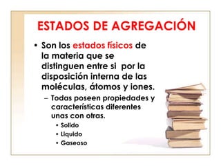 Este documento presenta los tres estados de la materia (sólido, líquido y gaseoso) y los cambios entre ellos. Describe las propiedades características de cada estado y los procesos por los cuales un estado cambia a otro, incluyendo la evaporación, ebullición, condensación, fusión, sublimación, solidificación, deposición y licuefacción. El objetivo es proporcionar una introducción básica a estos conceptos fundamentales de la química.
