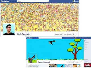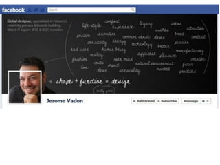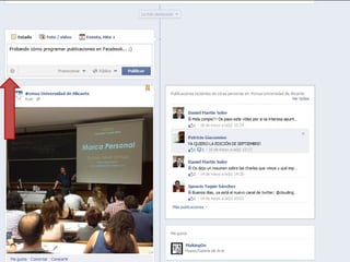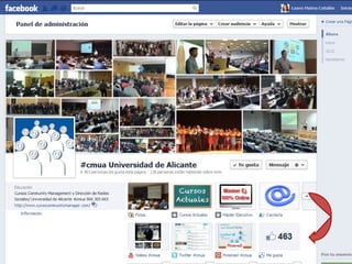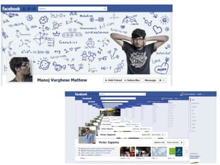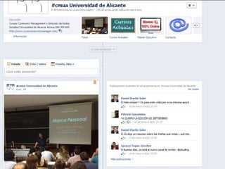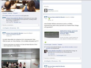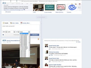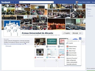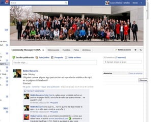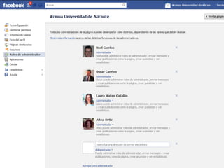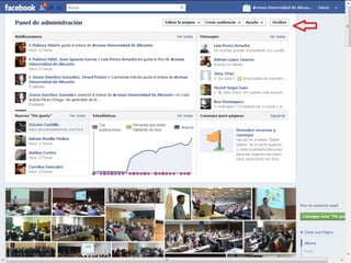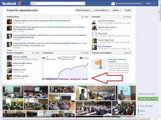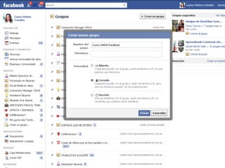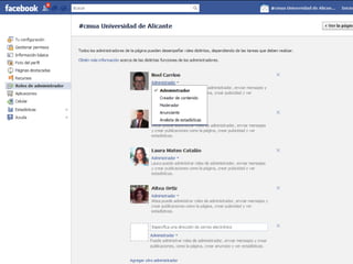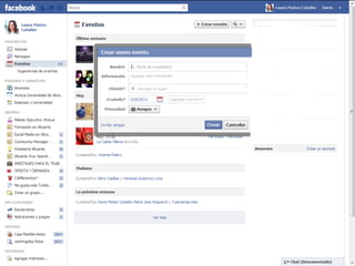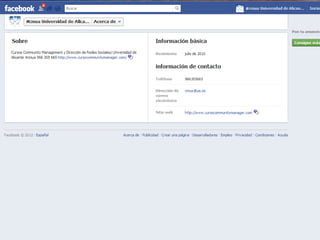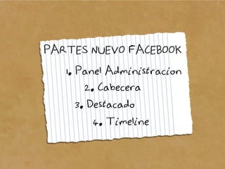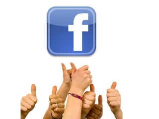 El documento detalla las reglas y características de uso de Facebook, como la necesidad de un perfil real, la gestión de amigos y grupos, y la promoción de páginas para empresas. También menciona la administración de contenido y el uso responsable de herramientas de promoción y eventos. Se incluyen enlaces a recursos adicionales sobre administración y cambios en la plataforma.