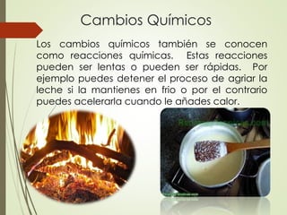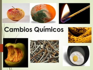 Los cambios químicos, o reacciones químicas, pueden ser rápidos o lentos y se evidencian en procesos cotidianos como la digestión o la cocción. Este documento describe ejemplos de cambios químicos, como la aceleración de reacciones al cortar materiales o la producción de dióxido de carbono mediante una reacción entre bicarbonato y vinagre. Se detallan observaciones y conclusiones que se pueden obtener de un experimento relacionado con la producción de gas.
