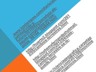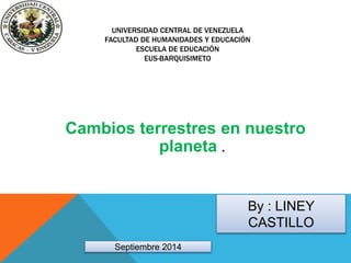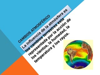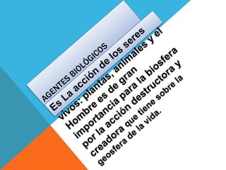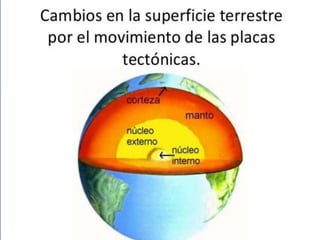 El documento resume los principales agentes de cambio terrestre. Los agentes externos (exógenos) como la atmósfera, el agua y los seres vivos causan cambios a través de procesos como la erosión. Los agentes internos (endógenos) como los magmáticos, sísmicos y tectónicos producen cambios repentinos o lentos a través de la actividad volcánica, los terremotos y los movimientos de placas tectónicas. Todos estos agentes interactúan para modificar continuamente la superficie ter