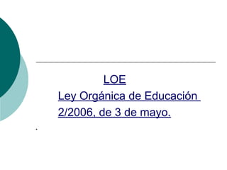 Este documento resume los principales cambios introducidos por la Ley Orgánica de Educación 2/2006 en las diferentes etapas educativas. En educación infantil se considera educativa la segunda etapa y se introduce lengua extranjera y TIC desde los 5 años. En primaria se refuerza la atención a la diversidad desde primero y todas las escuelas tendrán bibliotecas. En secundaria se permiten grupos flexibles y programas de diversificación, el cuarto curso es orientador y solo se puede repetir una vez por curso. En bachiller