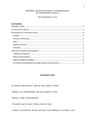 Este documento describe diferentes métodos anticonceptivos y enfermedades de transmisión sexual. Explica métodos anticonceptivos temporales como las píldoras, implantes y inyecciones que contienen hormonas, así como enfermedades como clamidia, gonorrea, sífilis, herpes y VIH/SIDA, y cómo se transmiten y sus síntomas. También resalta la importancia de consultar a un médico para elegir el método anticonceptivo más adecuado.