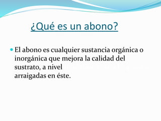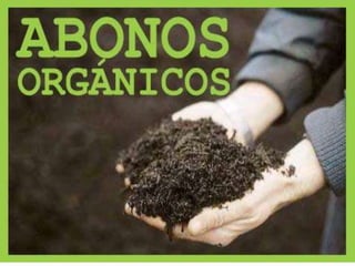 Este documento describe diferentes tipos de abonos, incluyendo abonos orgánicos y minerales. Explica que los abonos mejoran la calidad del sustrato para las plantas al mejorar sus nutrientes. Entre los abonos orgánicos se encuentran el estiércol de diferentes animales como vacas, caballos y cerdos, así como la gallinaza, el compost y el lombricompuesto. El compost se obtiene del proceso de compostaje de materiales biodegradables y constituye un grado intermedio entre la materia orgánica