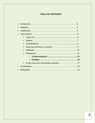 El documento proporciona información sobre wikis, incluyendo su historia, características, sitios para crearlos y usos educativos. Explica que un wiki es un software para crear contenido de forma colaborativa. Detalla que Ward Cunningham inventó el primer wiki en 1994 y que Wikipedia es el wiki más grande. Además, resume los principales sitios para crear wikis como MediaWiki, JSPWiki, MoinMoin y PmWiki.