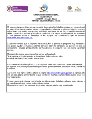 Una madre estaba triste porque no sabía usar su nuevo celular. Su hija le enseñó sobre la página Redvolución, que enseña sobre tecnología. La madre quería aprender a crear una cuenta de Facebook, así que su hija le explicó paso a paso cómo hacerlo. Después de crear su cuenta sola, la madre estaba satisfecha y agradeció a su hija por enseñarle sobre las redes sociales y la página Redvolución.