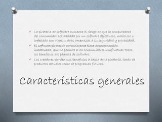El documento habla sobre los riesgos de la piratería de software, incluyendo que puede dañar la computadora del consumidor con software defectuoso o virus, que los creadores pierden beneficios que usan para crear nuevos programas, y que existen varios tipos como la piratería de usuario final, revendedor e Internet.