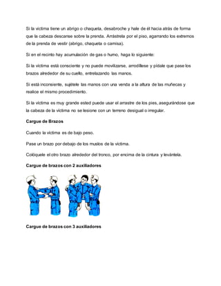 El documento proporciona instrucciones sobre el transporte seguro de víctimas de accidentes o personas enfermas. Describe métodos para levantar y transportar a una persona de forma segura, como arrastrar, cargar de brazos o con una camilla. También ofrece consejos sobre cómo improvisar una camilla y precauciones para prevenir mayores lesiones durante el traslado.