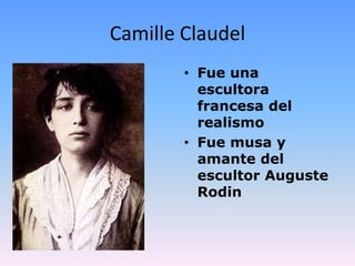Camille Claudel fue una escultora francesa del realismo en el siglo XIX. Fue musa y amante del escultor Auguste Rodin. Algunas de sus obras más importantes incluyen Sakountala (1888), Mujeres charlando (1893-1905), y El abandono (1905), que retoma el tema de su obra anterior Sakountala.