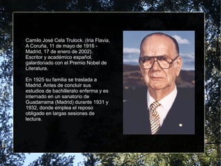 Camilo José Cela nació en 1916 en España y se convirtió en un destacado escritor y académico galardonado con el Premio Nobel de Literatura. Estudió medicina y derecho pero finalmente se dedicó a la literatura. Su primera gran obra fue La familia de Pascual Duarte en 1942. Más tarde vivió en Mallorca y fue elegido para la Real Academia Española. Recibió numerosos premios como el Príncipe de Asturias y el Cervantes, y fue nombrado Marqués de Iria Flavia.