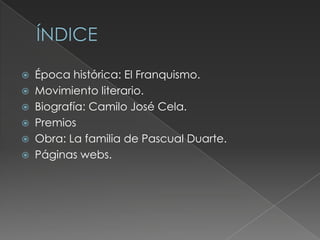 El documento trata sobre el escritor español Camilo José Cela durante el periodo de la dictadura franquista. Explica que Cela escribió la novela La familia de Pascual Duarte en 1942, la cual describe la difícil vida en España durante los años de la posguerra. Cela recibió numerosos premios como el Premio Nobel de Literatura en 1989 por su contribución a la literatura española.