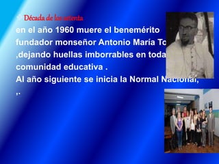 La Normal Superior de Florencia fue fundada el 8 de marzo de 1953 por el vicario apostólico del Caquetá, monseñor Antonio María Torasso, y otros cinco misioneros y misioneras para formar maestros de educación preescolar y primaria en la región. En la década de 1970 se inició la Normal Nacional y se autorizó la profesionalización de algunos maestros rurales. La institución ha sido dirigida por las Hermanas Misioneras de la Consolata y las Hermanas Franciscanas Misioneras de María Auxiliadora. Actualmente