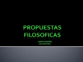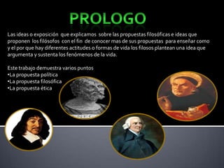 El documento presenta información sobre varios filósofos incluyendo sus ideas y propuestas filosóficas. Habla sobre Demócrito y su teoría atomista, la influencia de Aristóteles y su realismo natural, y también menciona a Platón, Descartes, Santo Tomás de Aquino, Adam Smith y Séneca, resumiendo aspectos clave de sus vidas y pensamientos filosóficos.