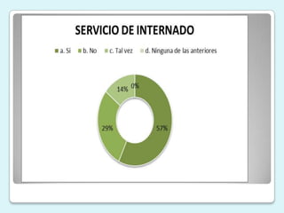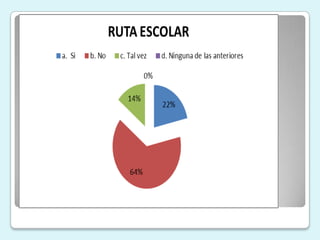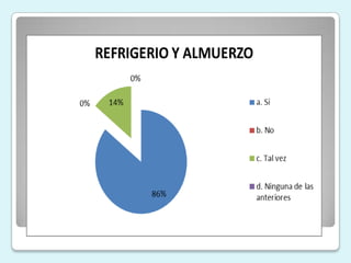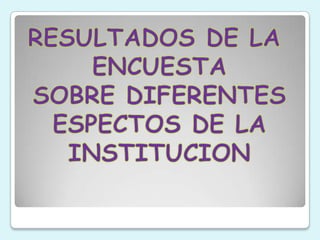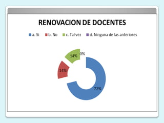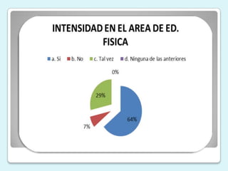 El documento presenta los resultados de varias encuestas realizadas a estudiantes sobre diferentes temas relacionados con su educación. La mayoría de los estudiantes quieren que los profesores tengan un salón asignado, poder elegir sus profesores para el año escolar, y aumentar las horas de educación física. Más del 70% también quieren un cambio de profesores y un nuevo horario de ingreso a la institución. La mayoría también están de acuerdo con tener dos jornadas diarias y que la institución ofrezca refrigerio y almu