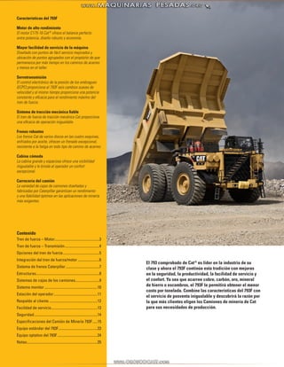 El documento proporciona información sobre el camión de minería 793F de Caterpillar. El 793F tiene un motor diesel de alta potencia, una transmisión de seis velocidades que proporciona cambios suaves, y frenos robustos. Está diseñado para transportar grandes cargas en condiciones exigentes con facilidad de servicio mejorada y comodidad para el operador.