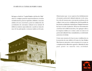 El documento describe un proyecto para convertir un antiguo molino en Puerto Varas, Chile en un centro cultural. El molino será renovado para albergar un auditorio, sala de exposiciones, centro de documentación y sala sobre geología. El centro cultural tiene como objetivo promover las artes y cultura locales y nacionales para enriquecer la oferta cultural y turística de la región.