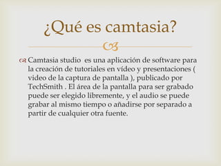 Camtasia Studio es un software de edición que permite grabar la pantalla y el audio de un usuario mientras realiza demostraciones o presentaciones, editar el video capturado agregando efectos de sonido y narración, y exportar el video final a diferentes formatos para su distribución.