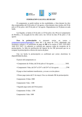 La Federación Gallega de Rugby organiza un campamento de verano de rugby para niños y niñas entre 1996 y 2005 en Ferrol del 24 de julio al 3 de agosto. Además de rugby, incluirá otras actividades como senderismo y surf, y contará con la presencia del ex jugador de los All Blacks Norm Maxwell. Se podrá asistir durante 10 días o 5 días, a diferentes precios.