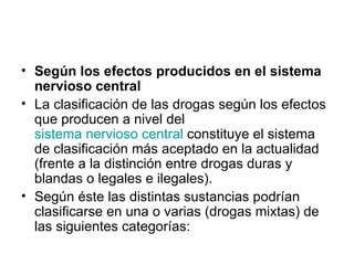 Este documento clasifica las drogas según sus efectos en el sistema nervioso central en cuatro categorías: depresores, estimulantes, alucinógenos y drogas mixtas. Los depresores inhiben el sistema nervioso central causando relajación y sedación, como el alcohol y los opiáceos. Los estimulantes activan el sistema nervioso central incrementando las funciones corporales, como la cocaína y las anfetaminas. Los alucinógenos alteran la percepción y evocan imágenes sin estímulos sensoriales, como el