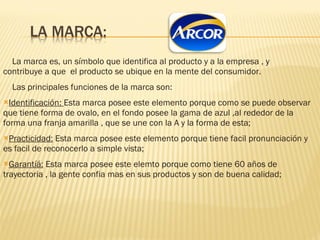 La marca Bon Bon de Arcor identifica el producto y la empresa, ayudando a posicionarlo en la mente del consumidor. Ofrece identificación, practicidad, garantía y capitalización a través de su diseño y trayectoria de 60 años. Se proponen cambios en el relleno y envoltorio para diversificar el producto.