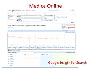 El documento presenta un plan de medios online que incluye campañas en Google, Facebook, y portales peruanos. El plan detalla los canales, formatos, dimensiones, tipos de pauta, valores por clic o impresión, y cronograma de inversión por semana de octubre. También propone palabras clave de búsqueda, alianzas comerciales y revistas para el público objetivo, con un presupuesto total de $75,250 para alcanzar 4.5 millones de impresiones.
