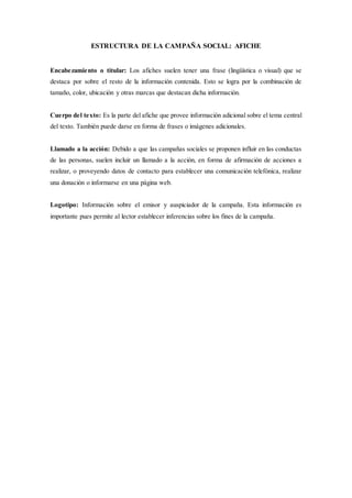 Este documento describe qué son las campañas sociales y su estructura cuando se utilizan afiches. Explica que una campaña social busca sensibilizar sobre problemas sociales e influir en el comportamiento de las personas mediante el uso de diferentes medios como afiches, televisión y folletos. Menciona que las campañas suelen financiarse por gobiernos u ONGs y se enfocan en áreas como derechos humanos, salud y medio ambiente. Finalmente, detalla que un afiche típicamente incluye un titular destacado, información adic