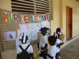 Este documento describe los esfuerzos de solidaridad de un colegio en Pamplona, España con una escuela en Haití. Detalla los desastres naturales que han afectado a Haití, incluyendo un terremoto en 2010 e inundaciones en 2012 y 2013. El colegio en Pamplona ha recaudado fondos para mejorar la alimentación y ampliar la biblioteca de la escuela en Haití.