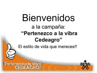 Este documento presenta la campaña "Pertenezco a la Vibra Cedeagro" cuyo objetivo es fortalecer los valores y la sana convivencia entre aprendices, instructores y personal del Centro de Formación del SENA Cedeagro. La campaña busca promover conductas de cuidado personal y del entorno, así como buenas relaciones entre los miembros de la comunidad educativa a través de actividades, talleres y materiales de difusión que enfatizan en valores como la responsabilidad y el respeto.