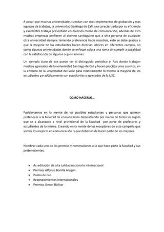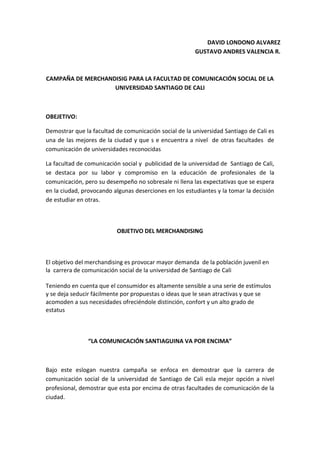 Este documento presenta una propuesta de campaña de merchandising para la Facultad de Comunicación Social de la Universidad Santiago de Cali. La campaña busca posicionar a la facultad como una de las mejores opciones de comunicación en la ciudad y atraer más estudiantes. La campaña utilizará esloganes, folletos, regalos promocionales y una caravana por la ciudad para promover los logros de la facultad y sus egresados. El público objetivo son estudiantes de grados 11 interesados en comunicación de estratos medios y bajos.