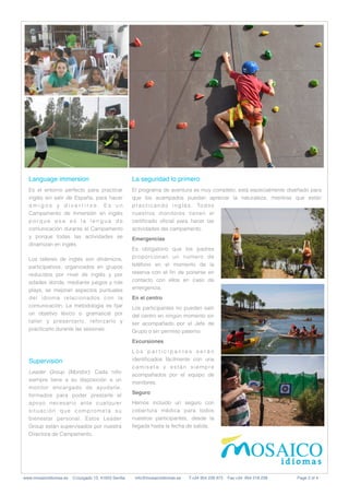 El campamento de inmersión en inglés ofrece una experiencia educativa para jóvenes de 8 a 16 años en Lepe, Huelva, con actividades que promueven el aprendizaje del idioma a través de la diversión y la aventura. Los participantes se alojan en instalaciones seguras y cuentan con monitores bilingües que guían talleres prácticos en inglés. Además, el programa incluye comida, actividades recreativas, y un enfoque en la seguridad de los participantes.