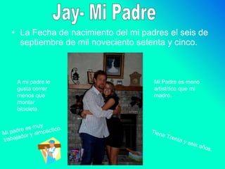 La Fecha denacimiento del mi padres el seis de septiembre de mil noveciento setenta y cinco. Tiene Trenta y seis años. Mi padre es muy trabajador y simpactico. A mi padre le gusta correr menos que montar bicicleta. Mi Padre es meno artistítico que mi madre. Jay- Mi Padre