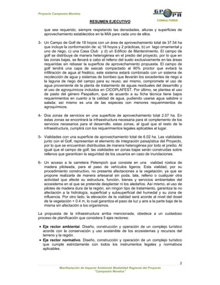 Este documento presenta un resumen ejecutivo del Proyecto Campestre Morelos. El proyecto consiste en el desarrollo de viviendas, un campo de golf, zonas comerciales y de servicios en 162.73 hectáreas en Puerto Morelos. El proyecto se desarrollará en 8 años en varias etapas y tendrá una vida útil de 99 años. El objetivo es desarrollar la zona de manera sustentable que impulse la economía local preservando el medio ambiente.