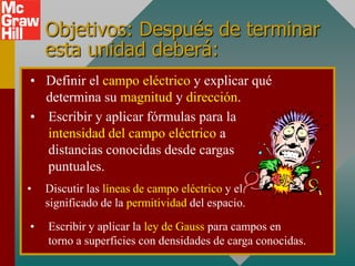 El documento presenta el concepto de campo eléctrico. Define el campo eléctrico como una propiedad del espacio que determina la fuerza experimentada por una carga en ese punto. Explica cómo calcular la intensidad del campo eléctrico a distintas distancias de una carga puntual y cómo dibujar las líneas de campo. También introduce la ley de Gauss para relacionar el número de líneas de campo que cruzan una superficie con la carga neta encerrada.