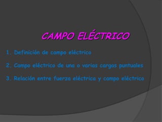 El documento describe el campo eléctrico y sus propiedades. Define el campo eléctrico como una propiedad del espacio que surge debido a la presencia de cargas eléctricas y explica cómo afecta a otras cargas. Detalla la intensidad del campo eléctrico producido por diferentes configuraciones de cargas puntuales, esféricas, planas y lineales, así como el principio de superposición. También describe cómo se representan gráficamente las líneas de campo eléctrico.
