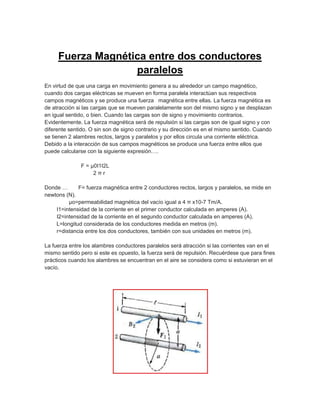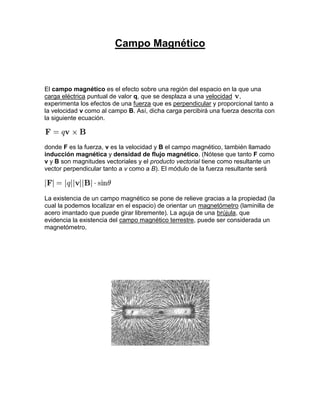 El documento trata sobre conceptos relacionados con los campos magnéticos y la inducción electromagnética. Explica que un campo magnético se produce cuando una carga eléctrica se mueve y que esta puede experimentar una fuerza perpendicular a su velocidad y al campo. También describe la inducción magnética, la ley de Lenz, la ley de Faraday y diferentes dispositivos como transformadores, motores eléctricos y relés que se basan en estos principios electromagnéticos.