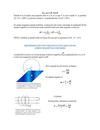 1) Un campo magnético se produce alrededor de una corriente eléctrica. 2) Ampere descubrió que el polo norte de una aguja imantada siempre se desvía hacia la izquierda de la dirección de la corriente. 3) La fuerza magnética sobre una partícula cargada depende de la carga, velocidad y ángulo respecto al campo magnético, haciendo que se mueva en órbitas circulares cuando el campo es uniforme.