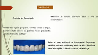 El documento describe los objetivos y ventajas del uso de diques operatorios en endodoncia, incluyendo controlar los fluidos orales, mantener el campo operatorio seco y libre de contaminación, y retraer los tejidos gingivales para protegerlos de posibles lesiones. Algunas ventajas clave son proporcionar un mejor campo visual, proteger al paciente contra aspiración y deglución de objetos, y crear un campo de trabajo aséptico.