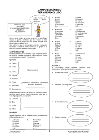 Este documento explica los conceptos de campo semántico y término excluido. Un campo semántico es un grupo de palabras que comparten un rasgo común en su significado. Se proveen ejemplos como tipos de asiento y objetos de playa para ilustrar este concepto. Luego, se explica que un término excluido es una palabra que no pertenece al campo semántico de un grupo dado. El documento contiene varios ejercicios para identificar términos excluidos.