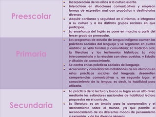 El documento describe los objetivos de la educación en diferentes niveles educativos. En preescolar, los objetivos incluyen incorporar a los niños a la cultura escrita y desarrollar su confianza. En primaria, los programas de lenguas indígenas se enfocan en prácticas sociales del lenguaje. En secundaria, la literatura se usa para fomentar la comprensión del mundo.