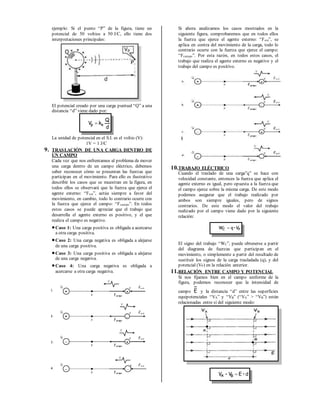 El documento trata sobre el concepto de campo eléctrico y potencial eléctrico. Explica que el campo eléctrico es la región de espacio que rodea a una carga eléctrica y a través de la cual se producen las interacciones eléctricas. Define la intensidad del campo eléctrico y la fuerza que experimenta una carga en dicho campo. También describe el principio de superposición de campos, las líneas de fuerza, y los campos eléctricos uniformes y estacionarios. Finalmente, introduce el