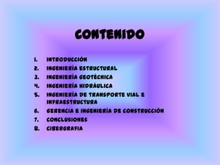 El documento describe los principales campos de la ingeniería civil, incluyendo la ingeniería estructural, geotécnica, hidráulica, de transporte vial e infraestructura, y gerencia e ingeniería de construcción. Cada campo se enfoca en un área diferente como la resistencia de estructuras, propiedades de suelos, diseño de obras hidráulicas, construcción de carreteras e infraestructura de transporte, y gerencia de proyectos y estimaciones de costos de construcción.