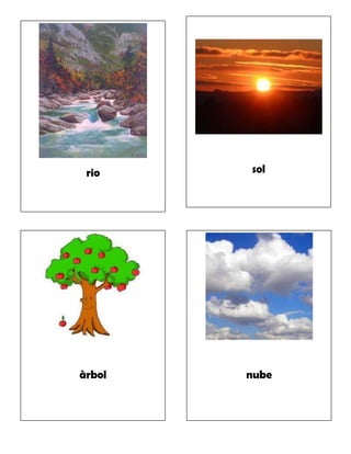 El documento describe varios objetos y conceptos como río, sol, árbol, nube, lluvia, viento, montaña, dinero, bandera, sacapuntas, computadora, diccionario, cuaderno, libro, goma, lápiz, cielo, flor, piedra y agua, sin conexión aparente entre ellos.