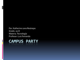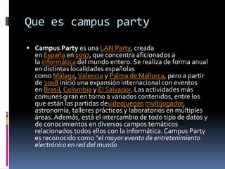 El documento proporciona información sobre Campus Party, una LAN Party anual que comenzó en España en 1997 y ahora se celebra en todo el mundo. Explica los orígenes de Campus Party, sus primeras ediciones en España y su expansión internacional a partir de 2008 en países como Brasil, Colombia y México. También describe las áreas temáticas cubiertas en el evento y algunos detalles sobre conferencistas invitados y participación en diferentes años.