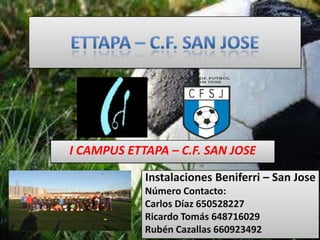 El documento proporciona información sobre un campus de fútbol en las instalaciones de Beniferri - San Jose dirigido a jugadores del Club Escuelas San José, e incluye los números de contacto de Carlos Díaz, Ricardo Tomás y Rubén Cazallas, así como las fechas del 25 de junio al 1 de julio y del 2 al 8 de julio.