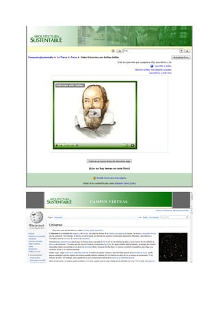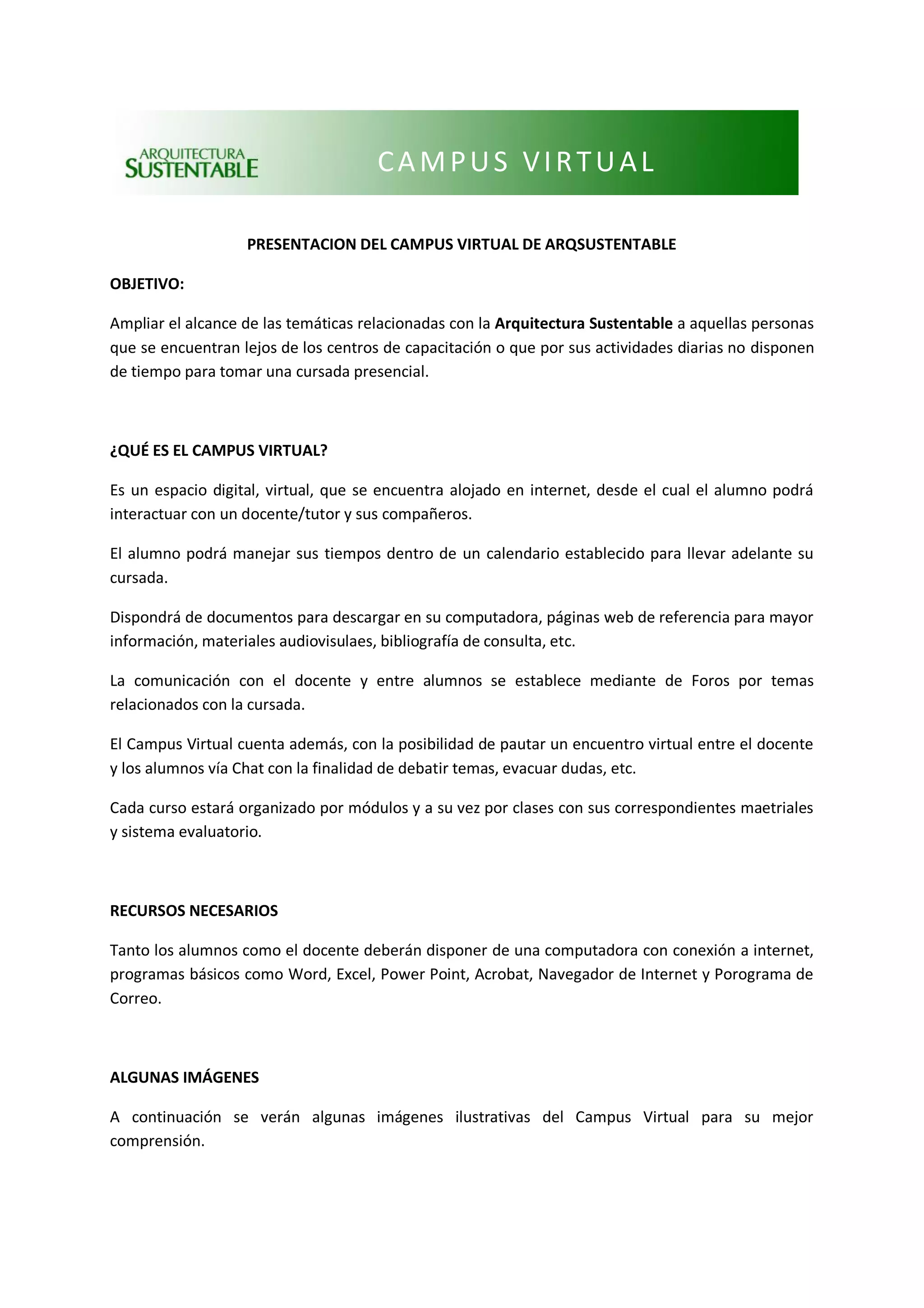 El documento presenta el Campus Virtual de ArqSustentable, un espacio digital alojado en internet que permite cursar asignaturas relacionadas con la arquitectura sustentable de manera virtual. El Campus Virtual busca ampliar el alcance de estas temáticas a personas que no pueden asistir a cursos presenciales. Los estudiantes podrán acceder a materiales y comunicarse con docentes y compañeros de manera virtual, organizando el curso en módulos, clases y foros de discusión. Se requiere conexión a internet y programas