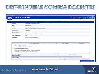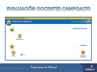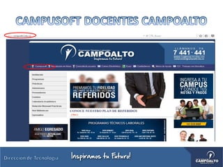 Este documento describe el sistema Campusoft, el cual permite a los docentes gestionar aspectos académicos como ingresar calificaciones de estudiantes, consultar listas de estudiantes y grupos asignados, y someterse a evaluaciones docentes, a través del ingreso con usuario y contraseña al sistema.