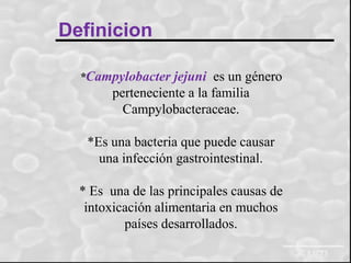 Campylobacter jejuni es una bacteria que causa infecciones gastrointestinales y es una de las principales causas de intoxicación alimentaria. Los síntomas incluyen fiebre, dolor abdominal y diarrea. Se diagnostica mediante un examen de cultivo fecal y generalmente se recupera sin tratamiento, aunque a veces se usan antibióticos. Se transmite principalmente por el consumo de alimentos o agua contaminados, contacto con animales infectados o contacto interhumano. Para prevenirla, es importante evitar la leche cruda, lavar utensilios que